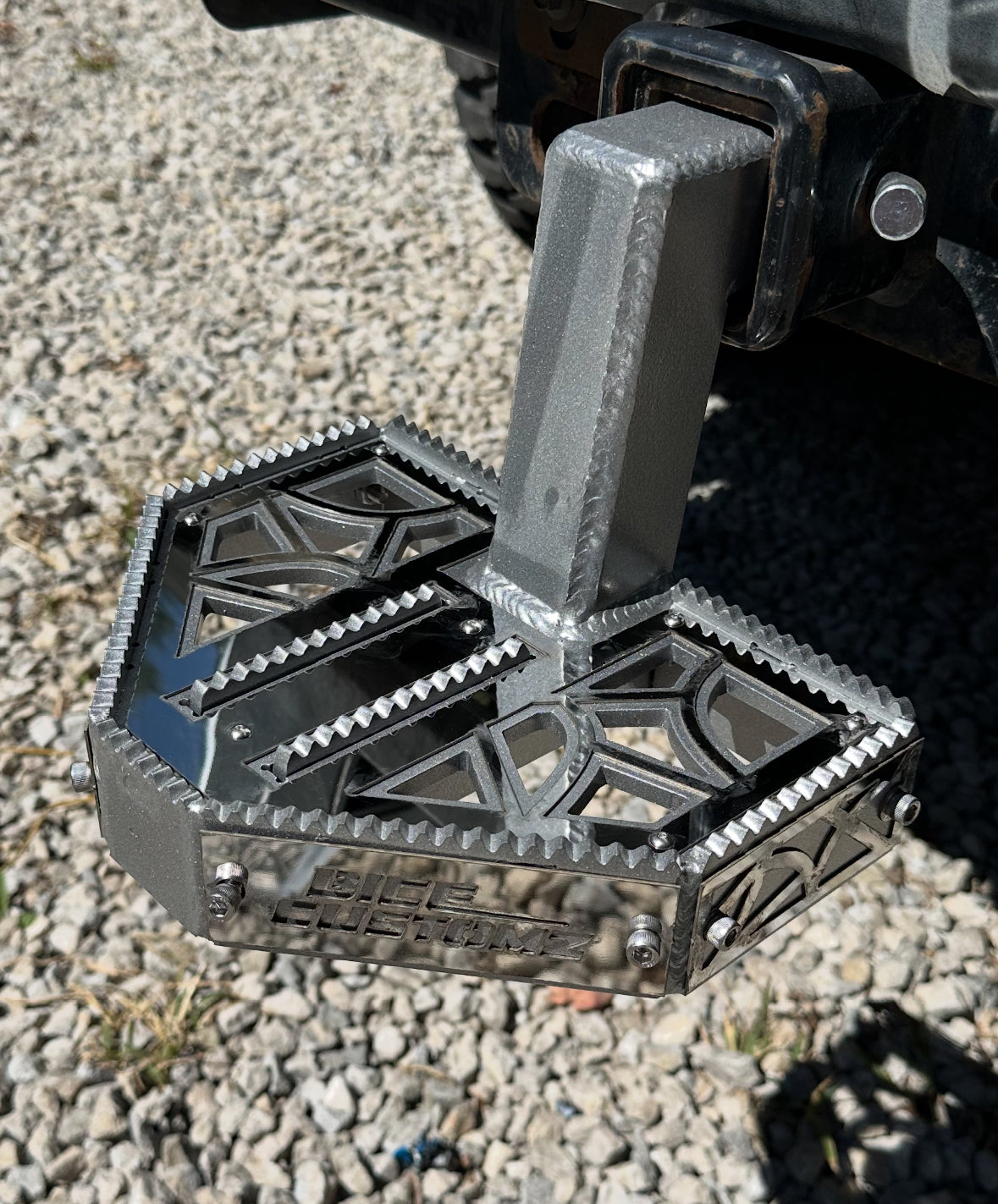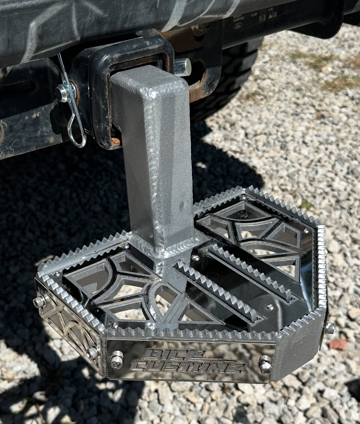 It’s exactly as it sounds! It is a step for your hitch… but with style. Standard is a 4” total drop on the step. For custom size drops please Call or Text us with your inquiries. Adds an awesome touch to the back of your truck or SUV, ridged dimples for extra grip and traction.